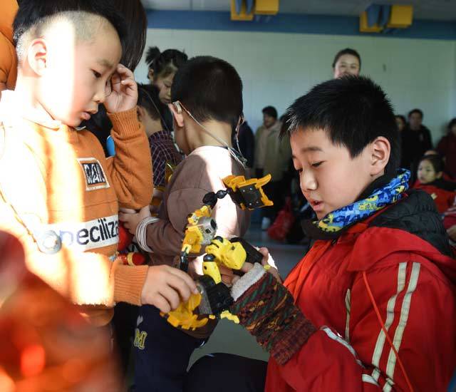 ↑锡林南路小学五年级二班的学生给康复中心的小朋友们教授变形金刚的组装方法。