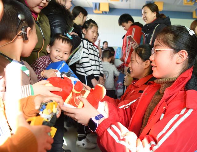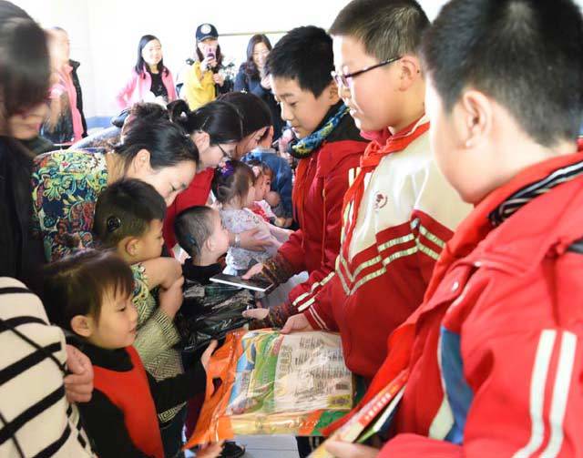 ↑锡林南路小学五年级二班的学生向康复中心的小朋友们赠送礼物。