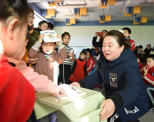 ↑锡林南路小学五年级二班班主任郎红滨向康复中心的小朋友们赠送书籍。