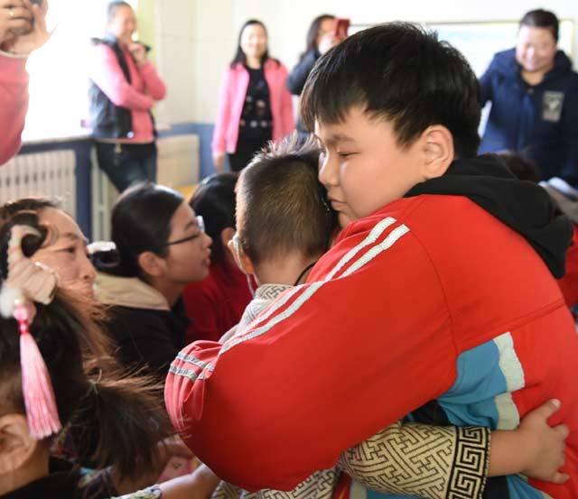 ↑锡林南路小学五年级二班的一名学生和康复中心的小朋友深情拥抱。